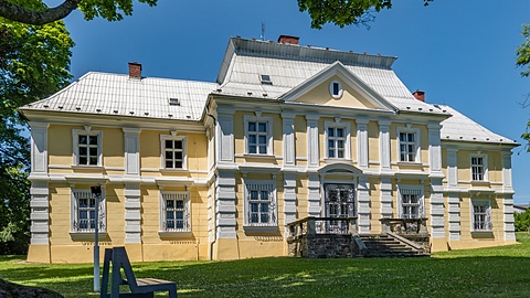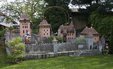 Dřevěná rozhledna. Zámek - obecní úřad. Model Karlštejna 1:33 - v části Nový Svět v zahradě u hospody.
