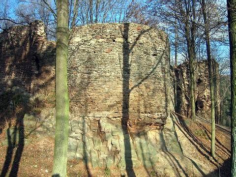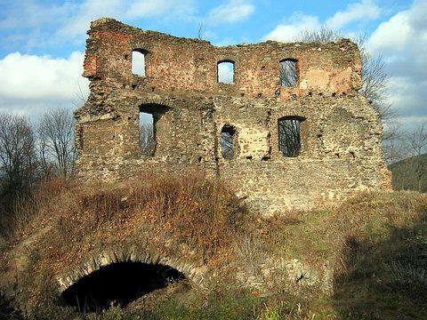 Zřícenina - zbytky paláce, věží a opevnění (V). |